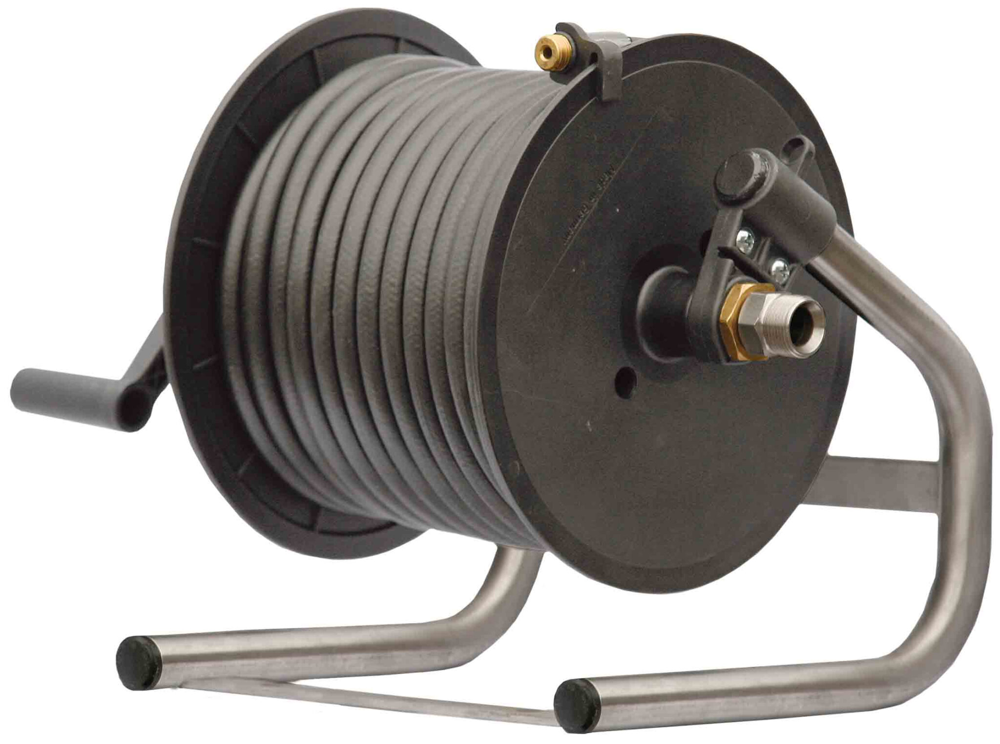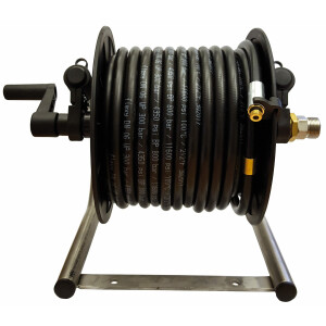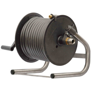 • 15 meter flexibel kloakslang på slangvinda av plast samt stativ av rostfritt stål.