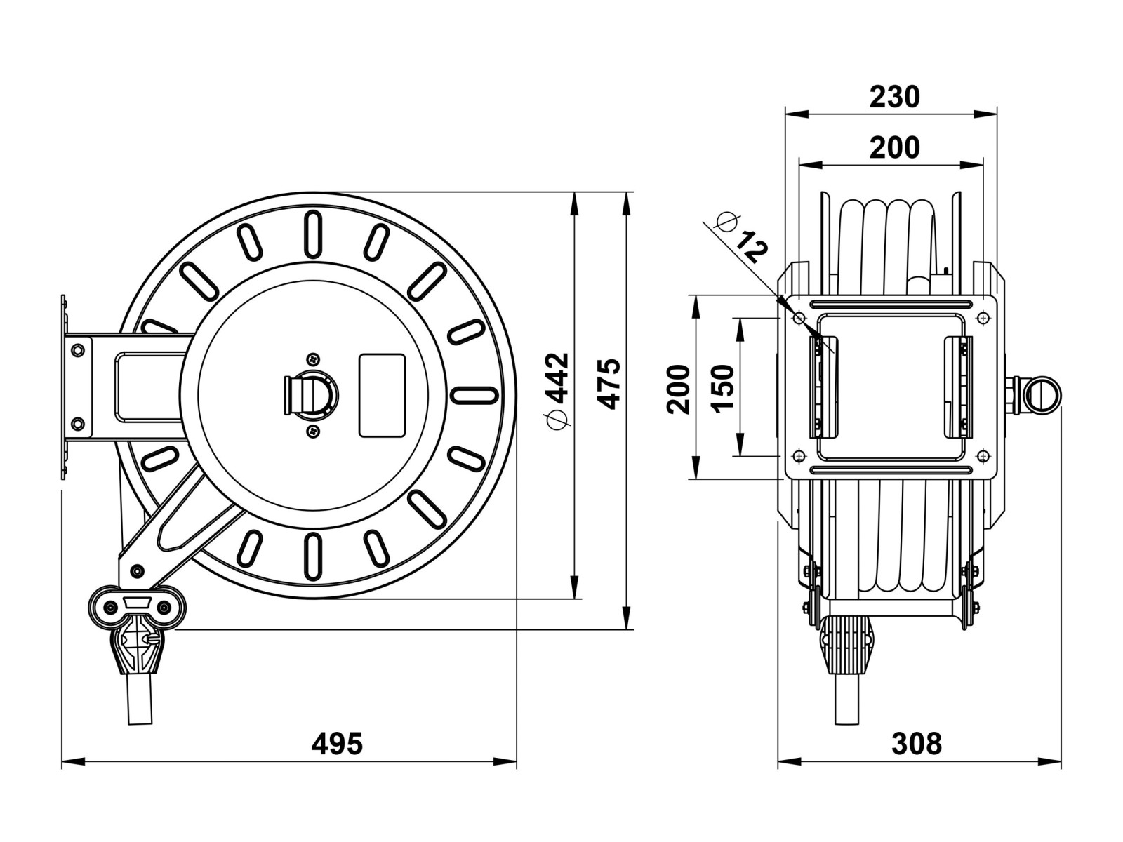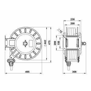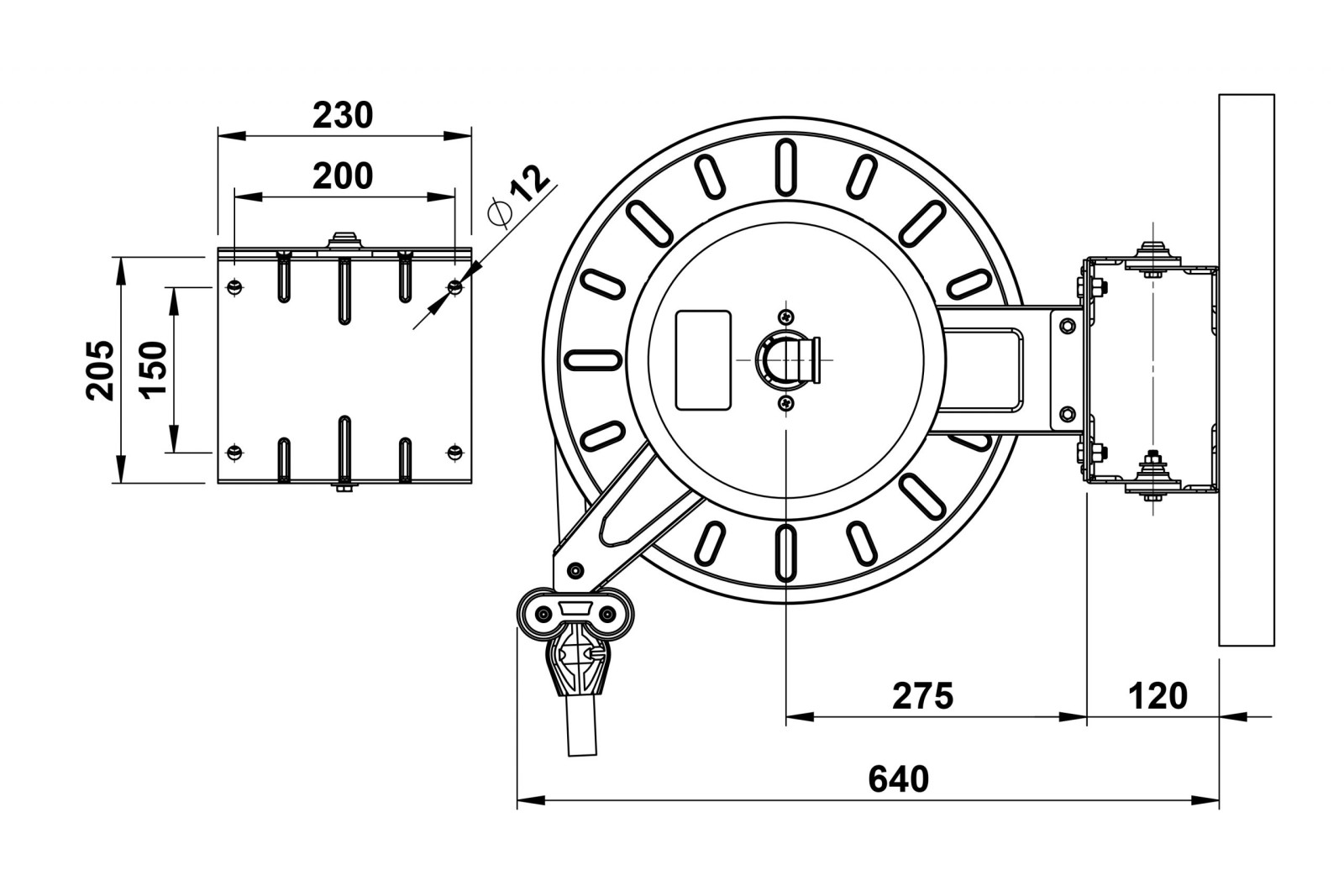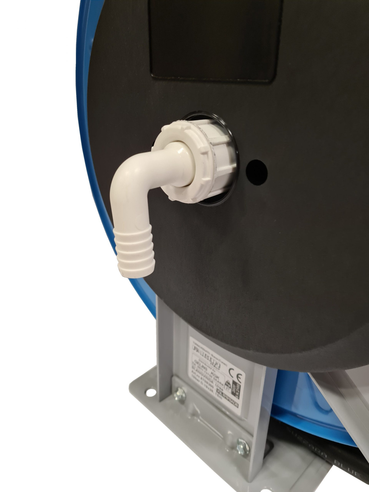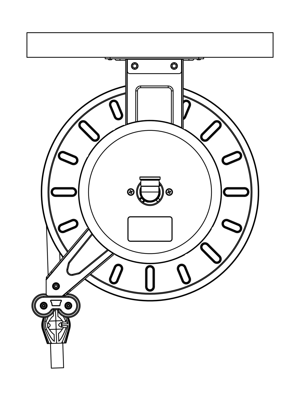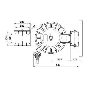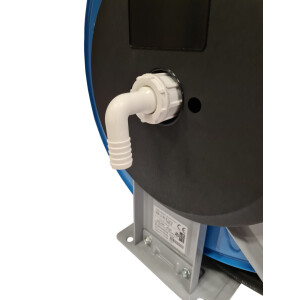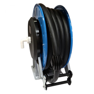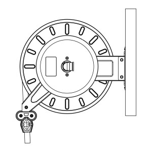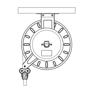 Slangvinda försedd med ställbara utmatningsarmar. Lätt att placera, även i trånga utrymmen. Kan även takmonteras. Vindan är pulverlackerad och utrustad med returfjäder. Kan kompletteras med svängbart väggfäste om slangen skall dras ut eller matas in i sidled. Slitaget på vindan blir mindre och slangen rullas upp jämnare. EPDM-slang.